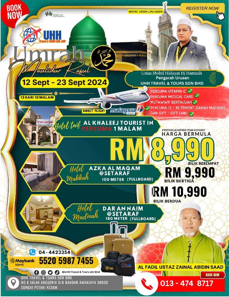 Dengan pakej ini, kami berusaha untuk memastikan setiap peserta mendapat pengalaman ibadah yang mendalam dan bermakna sempena Maulidur Rasul. Daftar segera dan raih peluang untuk menunaikan umrah sambil memperingati hari kelahiran Rasulullah SAW bersama orang tersayang!
